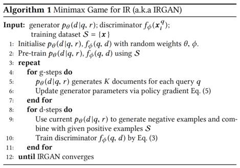 对IRGAN的training部分,G和D交叉进行更新。对于D,可以采用梯度下降更新法;对于G,由于G的输出是离散documents的概率分布,没办法直接采用梯度下降的方法求G的梯度,针对这种使用GAN训练离散数据的问题,可以采用强化学习中Policy Gradient的方法,reward由D给出。整个训练过程如下图算法所示: