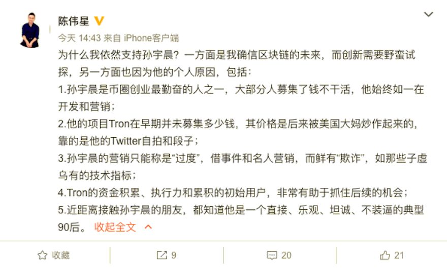 今日,波场创始人孙宇晨终于盼来了友军的支援。泛城资本、快的打车创始人陈伟星在微博上力挺孙宇晨。陈伟星表示:一方面是我确信区块链的未来,而创新需要野蛮试探,另一方面也因为“孙宇晨是币圈创业最勤奋的人之一,大部分人募集了钱不干活,他始终如一在开发和营销”、“孙宇晨的营销只能称是“过度”,借事件和名人营销,而鲜有“欺诈”,如那些子虚乌有的技术指标。”