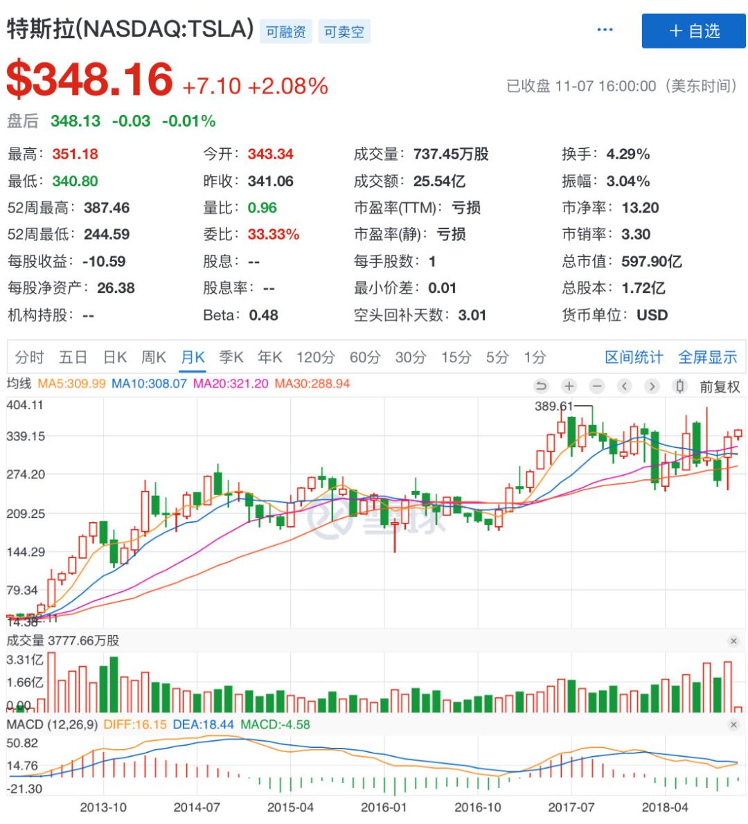 随后股价扭转此前一段时间的颓势,重拾涨势。截至上一个交易日,特斯拉跌2.08%,收于每股348.16美元,此前一度跌逾25%。