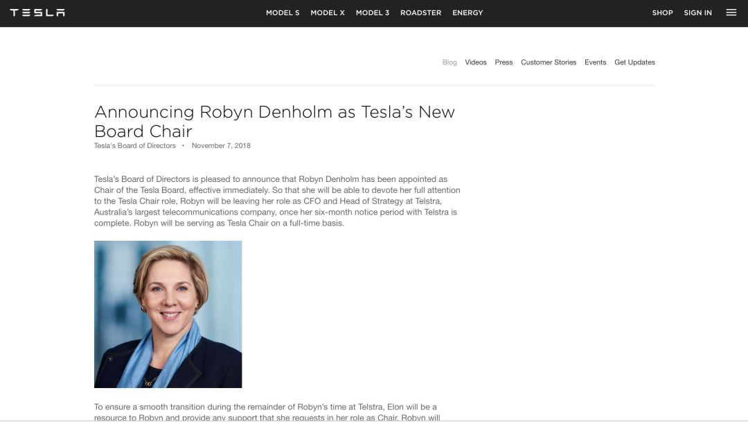 特斯拉董事会高兴地宣布,Robyn Denholm已被任命为特斯拉董事会主席,立即生效。为了让她能够全身心地投入到特斯拉主席的角色中,一旦她在特斯拉的六个月通知期结束,Robyn将离开她在澳大利亚最大的电信公司Telstra的CFO和战略主管的角色。Robyn将全职担任特斯拉主席。