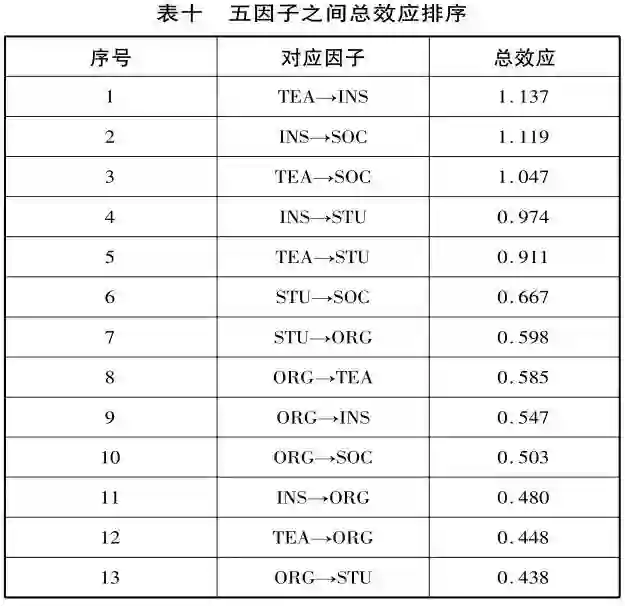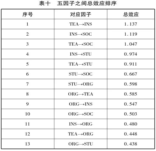 如表十所示,远程高等教育资源配置政策影响因子之间总效应按关系由强到弱排序依次是:教师教学能力—办学机构政策实施能力;办学机构政策实施能力—社会认可;教师教学能力—社会认可;办学机构政策实施能力—学生学习动机;教师教学能力—学生学习动机;学生学习动机—社会认可;学生学习动机—政府政策规划能力;政府政策规划能力—教师教学能力;政府政策规划能力—办学机构政策实施能力;政府政策规划能力—社会认可。由此可见,远程高等教育资源配置政策影响因子之间具有紧密联系、相互影响效应。具体资源配置政策影响因素路径系数与因果效应结构如图6所示。