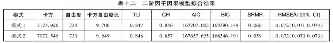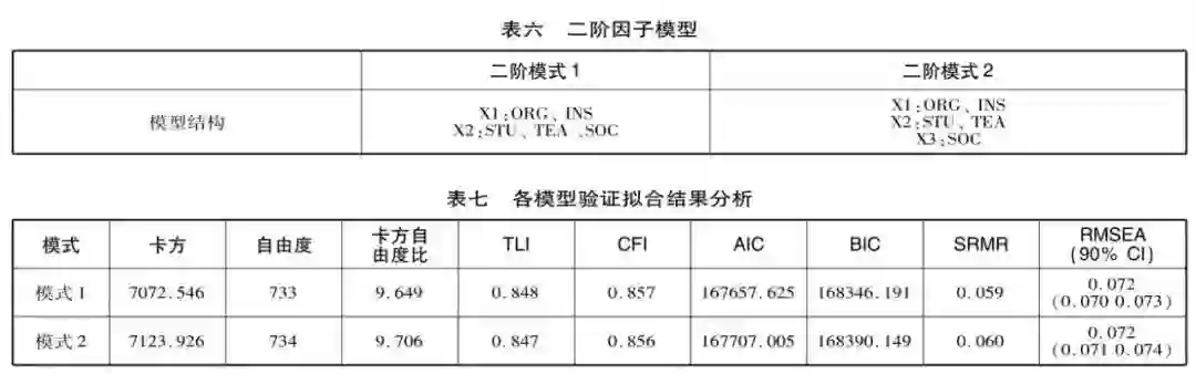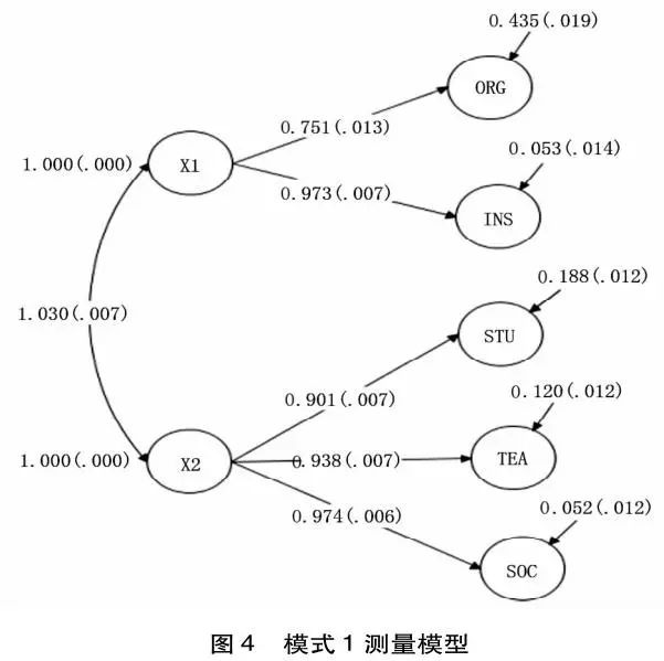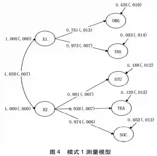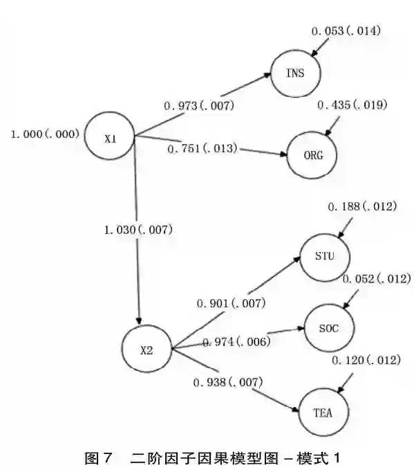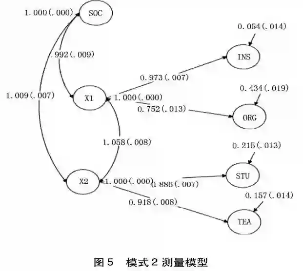 其中模式1是将政府政策规划能力与办学机构政策实施能力作为远程高等教育资源配置政策制定主体(X1),将学生学习动机、教师教学能力和社会认可作为远程高等教育资源配置政策实施和接受客体(X2)。模式2是将政府政策规划能力与办学机构政策实施能力作为资源配置政策制定主体(X1),将学生学习动机、教师教学能力作为远程高等教育资源配置政策资源配置实施和接受客体(X2),将社会认可作为外援因素(X3)。各模型验证拟合结果分析见表七。
