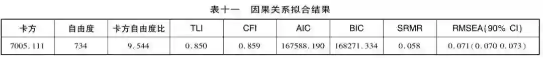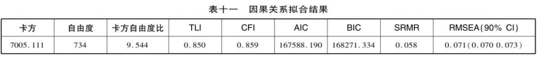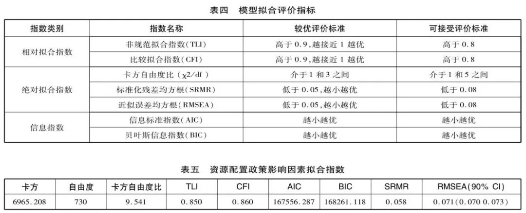 资源配置政策影响因素效果结构模型拟合结果表明(见表十一),除卡方自由度受大样本影响较明显外,TLI、CFI都高于0.8,SRMR、RMSEA均小于0.08,达到模型拟合指标标准。因此,该因果效应结构模型成立。