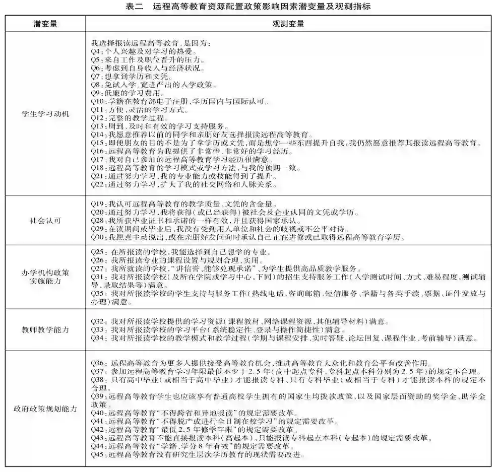 通过对中国知网等学术文献库的研究成果进行检索与统计发现,目前学术界关于教育政策、教育资源配置的相关研究很多,但对教育资源配置与教育政策相结合的研究特别是对远程高等教育资源配置政策进行全面和深入研究的还比较少。从资源配置视角对我国远程高等教育政策进行研究,一方面有助于远程高等教育资源特别是优质远程高等教育资源在不同教育机构、不同地区、不同学习者之间形成高效优化的配置结构;另一方面也有助于在充分认识和规避风险的情况下,探索建立一套有效推动远程高等教育资源配置政策制定和评估机制,丰富和深化远程高等教育资源配置理论建构。实际上,远程高等教育资源配置也是利用政策调整教育发展要素组合的过程,因此,找出远程高等教育资源配置政策制定与实施过程的影响因素并对其进行分析论证,成为相关政策的重要前提和内容。本研究将在文献梳理的基础上,对远程高等教育资源配置政策的主要和关键影响因素进行界定,并通过问卷调查等方式,利用SPSS21.0、Mplus7.0工具和验证性因子分析法、结构模型法,得出反映资源配置影响因素关系的测量结构模型和因果结构模型。