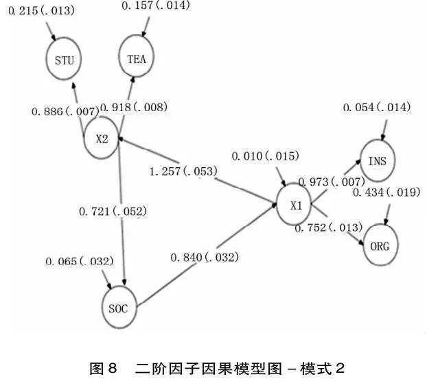 为了更好地理解资源配置政策影响因素的影响效应,本研究在一阶因果效应结构模型的基础上,结合二阶测量模型进行了二阶因子因果结构效应分析。政府政策规划能力与机构政策实施能力形成的资源配置政策主体(X1)对学生学习动机、教师教学能力和社会认可形成的远程高等教育资源配置政策实施和接受客体(X2)具有显著影响(见图7);政府政策规划能力与办学机构政策实施能力作为政策制定主体(X1)对把学生学习动机、教师教学能力作为实施和接受客体(X2)具有显著影响,社会认可作为外援因素(X3)—方面受客体(X2)学生学习动机和教师教学能力的显著影响,另一方面又对主体(X1)政府政策规划能力与办学机构政策实施能力具有显著影响(见图8)。这也说明远程高等教育资源配置政策影响因素的复杂性。