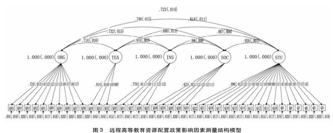 如表三所示,与学生学习动机影响系数与关联度最大的影响因子是社会认可,路径系数达到0.926;其次是办学机构政策实施能力和教师教学能力,路径系数分别是0.887和0.814;最后是与政府政策规划能力路径系数,也达到0.723。政府政策规划能力与学生学习动机、社会认可、办学机构政策实施能力、教师教学能力四个因素之间的路径系数均超过0.7。教师教学能力与办学机构政策执行能力的影响系数与关联度最大,其次是与社会认可和学生学习动机的影响度都很高。办学机构政策实施能力与社会认可和学生学习动机关联度也很高,都超过了0.8,其次是与政府政策规划能力与办学机构政策实施能力的关联度较大,路径系数超过0.70。远程高等教育资源配置政策相关系数矩阵和测量结构图也说明五个潜变量因子之间存在高度的相关性以及潜在的二阶因子,同时说明学生学习动机与政府政策规划与制定能力处于资源配置政策的客体与主体的核心地位。对资源配置政策的社会认可主要体现在政府政策规划能力与学生学习动机两个方面。