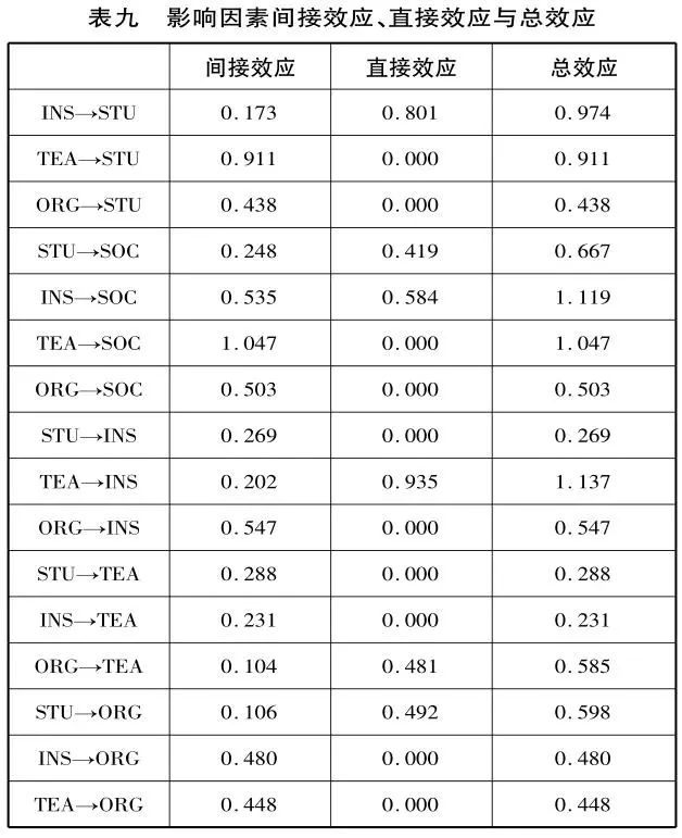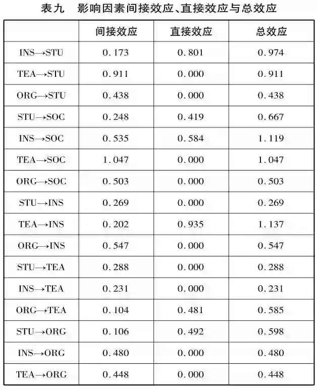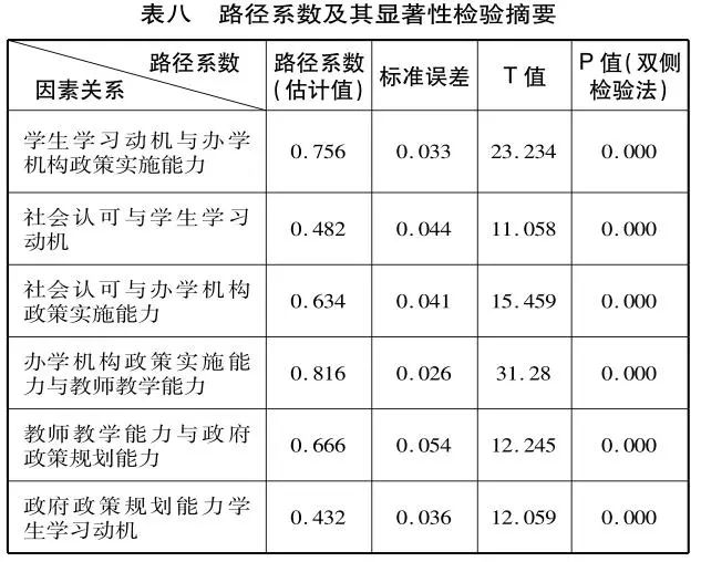 间接效应共有7条路径系数有显著效应,其中4条路径系数超过0.5.教师教学能力与学生学习动机之间的间接效应路径系数是0.911;政府政策规划能力与学生学习动机之间具有间接效应,路径系数是0.438;办学机构政策实施能力与社会认可具有间接效应,路径系数是0.535;政府政策规划能力与办学机构政策实施能力之间具有间接效应,路径系数是0.547;办学机构政策实施能力、教师教学能力与政府政策规划能力之间具有间接效应,路径系数分别为0.480、0.448;办学机构政策实施能力与社会认可之间既有直接效应(0.584),又有间接效应(0.535)。