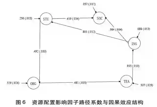 从资源配置政策影响因素的直接效应路径系数可以看出,办学机构的实施能力在整个因果结构中具有核心作用,其次是教师与学生作为实施客体与对象也具有重要作用,政府政策规划能力通过教师的实施能力对学生产生作用。其中,办学机构政策实施能力、教师教学能力、学生学习动机是政策实施的内衍变量,政府政策规划能力是外衍变量,社会认可是具有促进作用的外部因素。