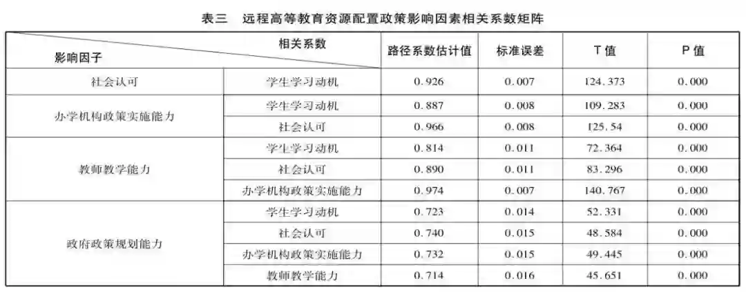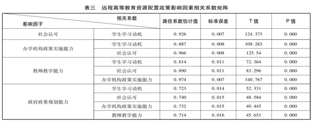 总之,在中国远程高等教育资源配置政策影响因素中,学生学习动机与政府政策规划能力、社会认可具有直接因果关系;政府政策规划能力与教师教学能力具有直接因果关系;教师教学能力与办学机构政策实施能力具有直接因果关系;办学机构政策实施能力与学生学习动机和社会认可具有直接因果关系。政府政策规划与制定能力是资源配置政策影响因素的外衍变量,办学机构的政策执行能力、教师教学能力、学生学习动机是其内衍变量。但这些变量不是独立的要素,通过相互作用共同形成了资源配置政策主体、客体及相互作用整体。