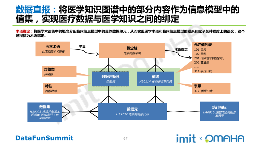 将医学知识图谱中的部分内容作为信息模型中的值集,实现医疗数据与医学知识之间的绑定。术语绑定指:将医学术语集中的概念分配临床信息模型中的具体数据单元,从而实现医学术语和临床信息模型的联系和赋予某种程度上的语义。读者可参考下图理解: