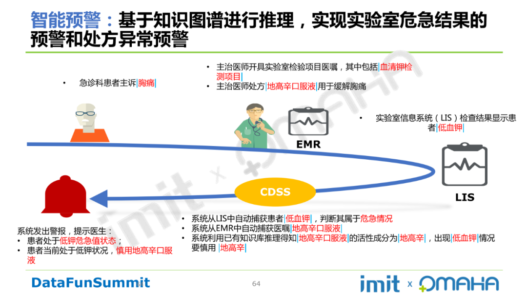 此外,还可基于知识图谱进行推理,实现实验室危急结果的预警和处方异常预警。如下胸痛案例所示:
