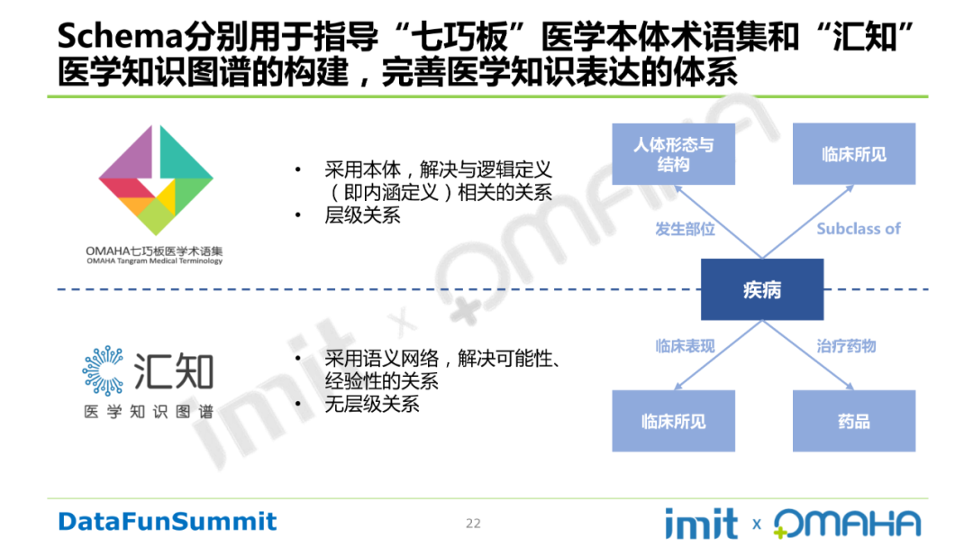 Schema分别用于指导“七巧板”医学本体术语集和“汇知”医学知识图谱的构建,完善医学知识表达的体系。我们之所以在一个模型指导下构建两个知识库,是为了解决不同的问题。“七巧板”采用本体解决与逻辑定义(即内涵定义)相关的关系,以及层次关系。“汇知”采用语义网络解决可能性、经验性的关系,并且无层次关系。具体请看下图: