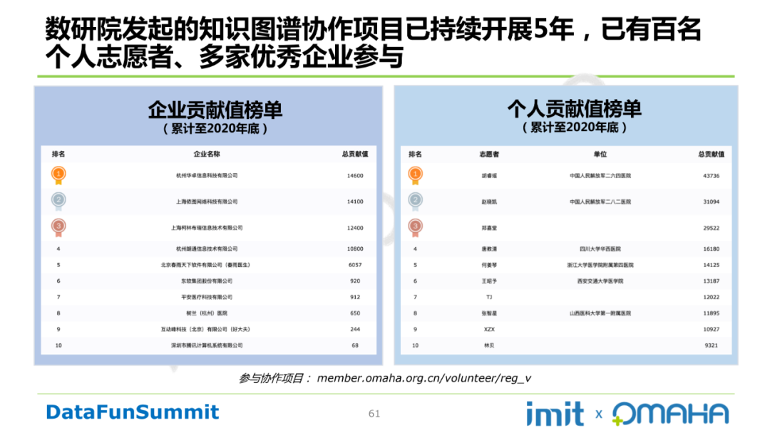 最后,数研院发起的知识图谱协作项目已持续开展5年,已有百名个人志愿者、多家优秀企业参与。贡献榜如下所示: