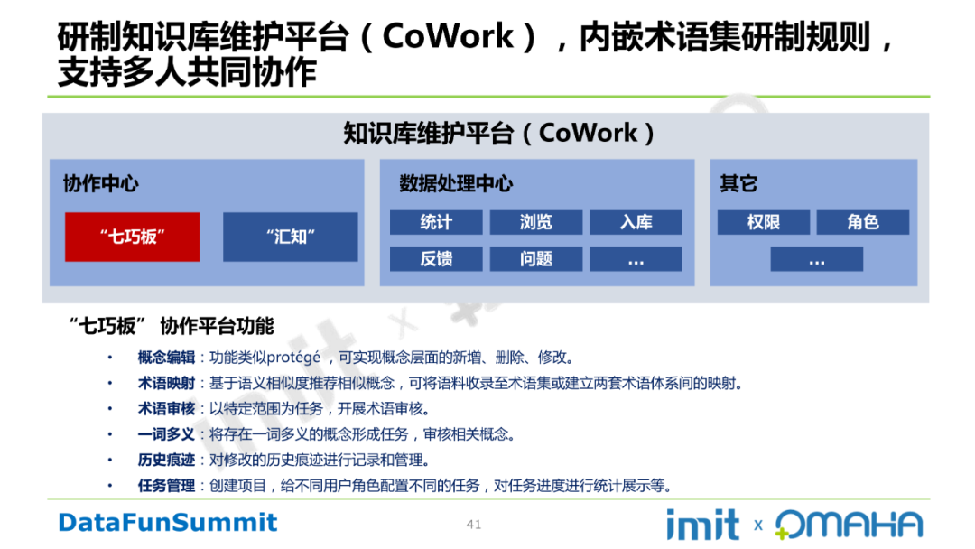 Step6:平台及工具支撑。自研的知识库维护平台(CoWork),内嵌术语集研制规则,支持多人共同协作。CoWork中“七巧板”的功能如下所示: