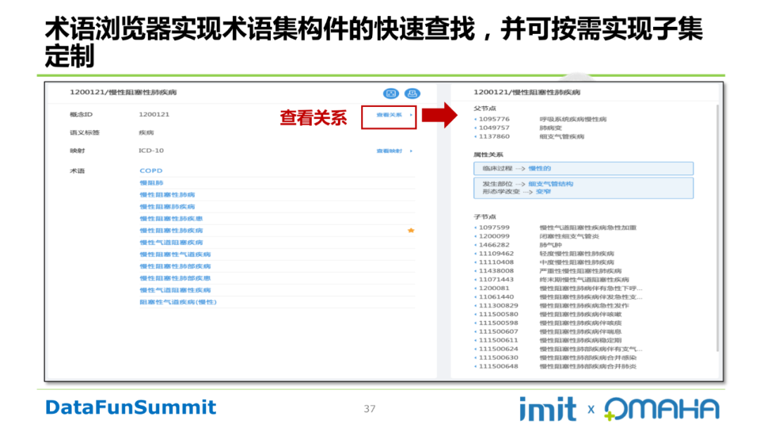 Step5:存储和浏览。采用关系型数据库,分为概念表、术语表、关系表、映射表进行存储,且保留历史痕迹。术语浏览器实现术语集构建的快速查找,并可按需实现子集定制。如查看关系操作如下所示: