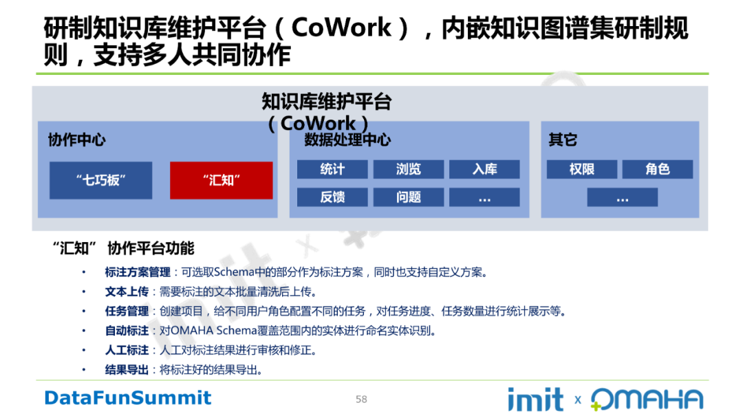 Step5:平台及工具支撑。自研知识库维护平台(CoWork),内嵌知识图谱集研制规则,支持多人共同协作。CoWork中“汇知”的功能描述如下: