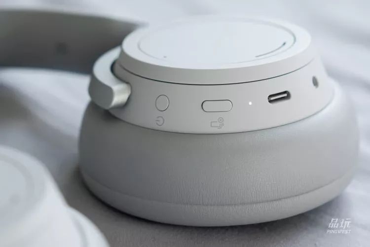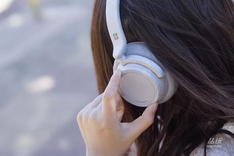 从触控面板向外延展,耳罩的圆环实则是旋钮。左侧负责降噪调节,右侧负责音量调节。这是微软在无线降噪耳机中创造的独一无二的交互方式。