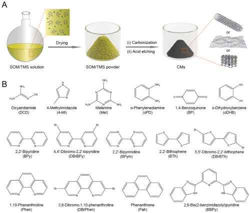 (A)过渡金属辅助碳化有机分子制备碳纳米材料的示意图;(B)该方法所使用的有机小分子前驱物的结构