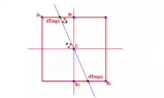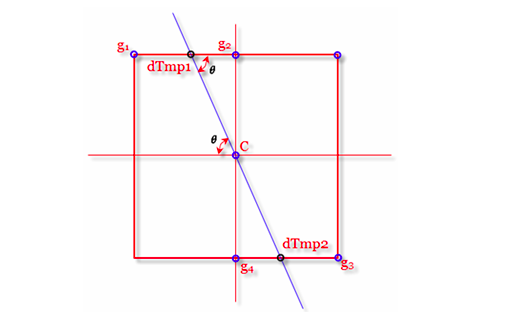 但实际上,我们只能得到C点邻域的8个点的值,而dTmp1和dTmp2并不在其中,要得到这两个值就需要对该两个点两端的已知灰度进行线性插值,也即根据图中的g1和g2对dTmp1进行插值,根据g3和g4对dTmp2进行插值,这要用到其梯度方向。