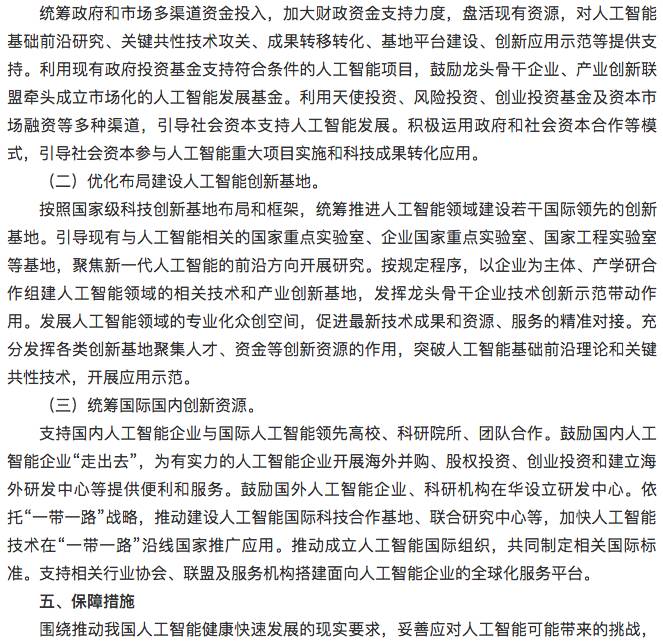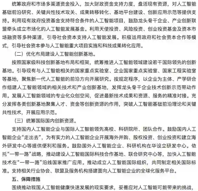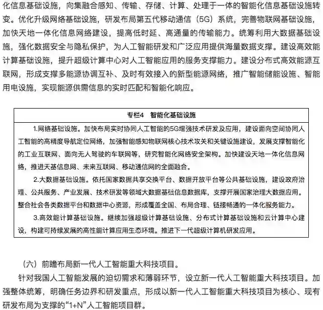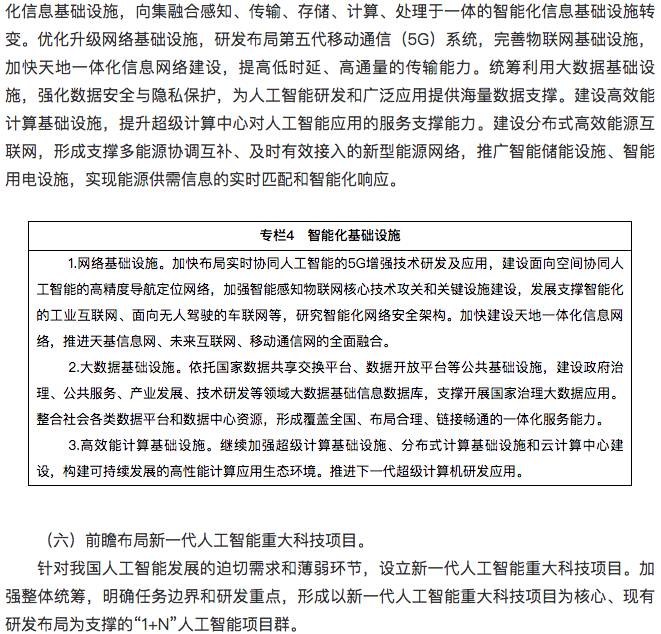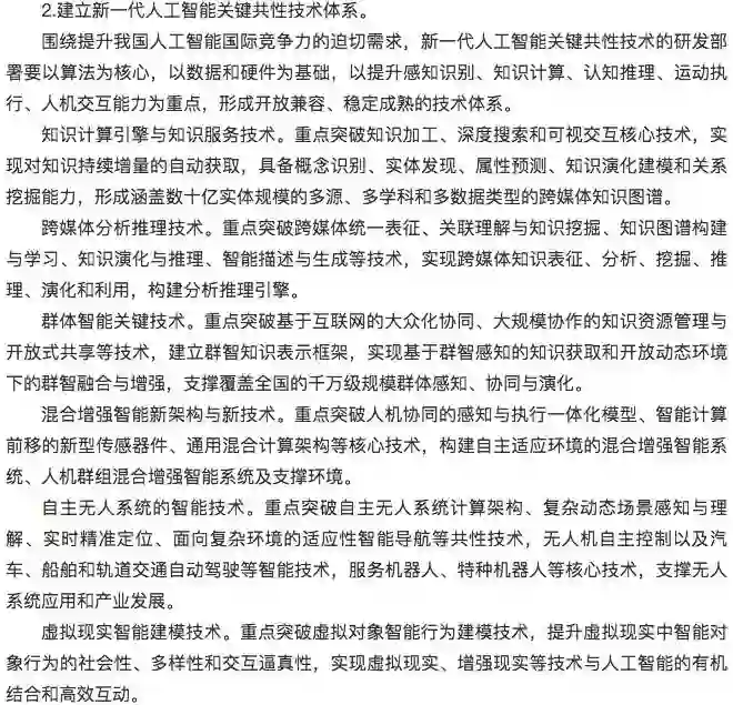建设布局人工智能创新平台,强化对人工智能研发应用的基础支撑。人工智能开源软硬件基础平台重点建设支持知识推理、概率统计、深度学习等人工智能范式的统一计算框架平台,形成促进人工智能软件、硬件和智能云之间相互协同的生态链。群体智能服务平台重点建设基于互联网大规模协作的知识资源管理与开放式共享工具,形成面向产学研用创新环节的群智众创平台和服务环境。混合增强智能支撑平台重点建设支持大规模训练的异构实时计算引擎和新型计算集群,为复杂智能计算提供服务化、系统化平台和解决方案。自主无人系统支撑平台重点建设面向自主无人系统复杂环境下环境感知、自主协同控制、智能决策等人工智能共性核心技术的支撑系统,形成开放式、模块化、可重构的自主无人系统开发与试验环境。人工智能基础数据与安全检测平台重点建设面向人工智能的公共数据资源库、标准测试数据集、云服务平台等,形成人工智能算法与平台安全性测试评估的方法、技术、规范和工具集。促进各类通用软件和技术平台的开源开放。各类平台要按照军民深度融合的要求和相关规定,推进军民共享共用。