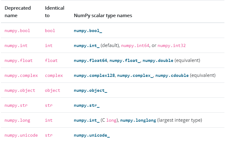 像 np.int 这类内置类型(builtin type)的别名已被弃用。在很长一段时间,np.int 是 int 的别名,但常常对新手造成困扰,这主要是历史原因造成的。