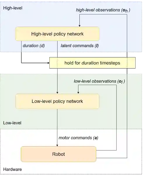 分层策略的框架:此策略从机器人获得观察结果,并发送电机命令以执行期望的动作。此框架分为两个级别(高和低)。高级策略会向低级策略发出潜在命令,同时确定低级策略的运行持续时间