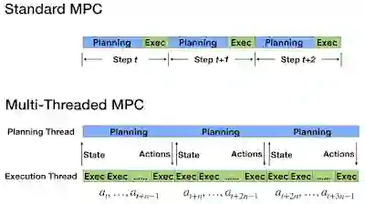 为满足严格的时间限制,我们引入了多线程异步版 MPC,动作规划和执行在不同线程上完成。执行线程频繁地执行动作,而规划线程则随之对后台动作进行优化。此外,由于动作规划可能需要多个时间步,因此完成规划后机器人的状态可能已经发生变化。为了解决规划延迟问题,我们设计了一种新的补偿技术:首先会预测规划器预计完成计算时的未来状态,然后使用该未来状态为规划算法提供种子。
