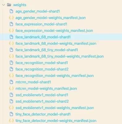 通过该算法,face-api.js 训练了一系列的模型,通过使用这些已经训练好的模型,我们可以快速实现我们想要的功能。