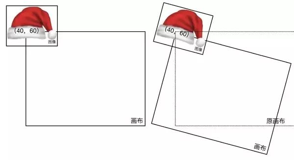 这里,我们只想让图片按照中心旋转怎么办?我们可以先让 Canvas 把原点平移到帽子的位置,然后再通过帽子的内部偏移使得帽子中心刚好在原点,此时再旋转画布把帽子画上就只影响这一个帽子图片了。
