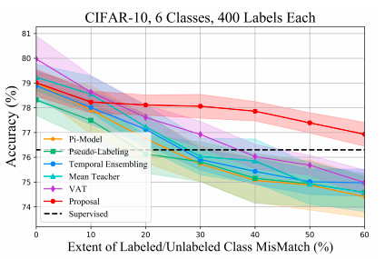 实验中所有方法明显优于具有相同类分布的基线监督学习方法。但是,随着类分布不匹配的加剧,现有的深度SSL方法的性能迅速下降。