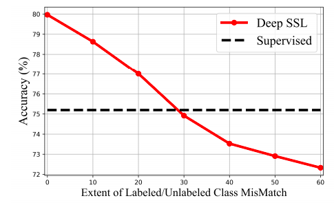 面对这种情况时,深度半监督模型的表现不再优异,甚至会出现性能大幅度下降的情况。