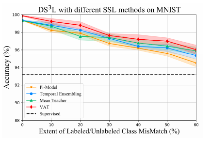 DS3L可以通过简单的无监督正则化获得最佳性能,即使类不匹配率超过60%。所有这些结果表明,我们提出的DS3L非常有效地防止了类分布不匹配引起的性能下降。