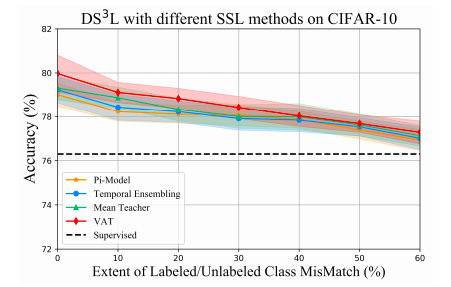 当40%的无标签实例来自未知的类时,许多深度SSL技术甚至都不如基线监督学习方法,而我们的DS3L在存在超过60%的未知类无标签实例的情况下仍可以保持明显的性能改进,即无标签实例甚至比相关实例更多。这些经验结果与理论分析一致,并证明了DS3L的有效性。