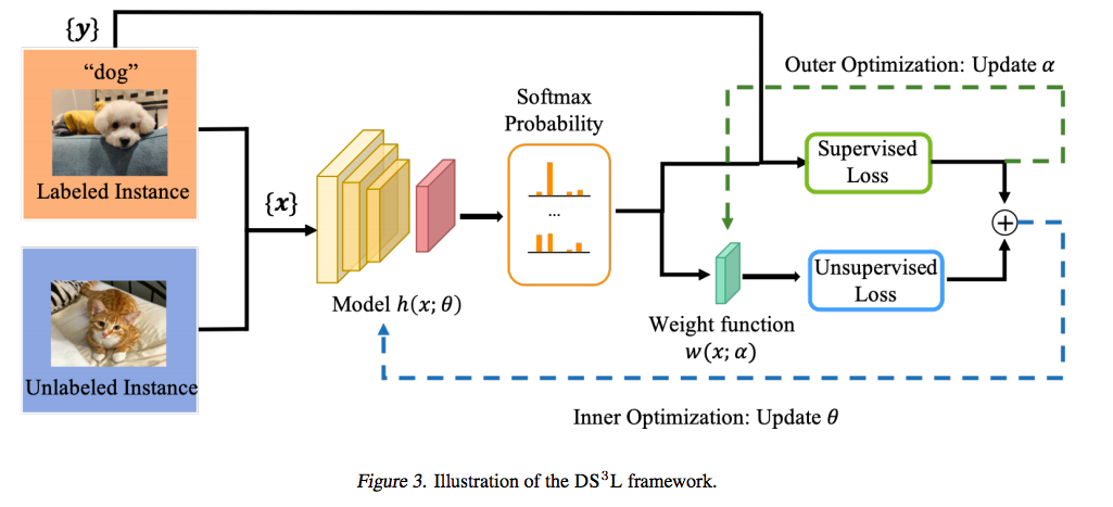 这篇论文介绍了一个简单有效安全的方法:DS3L(Deep Safe Semi-Supervised Learning)。不像其他深度半监督学习模型,DS3L并不是利用所有的无标签数据集,而是有选择的并且跟踪监督学习模型的影响来避免「性能灾难」。
