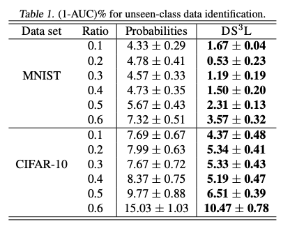 通过将未知分类的无标签数据视为否定类别,将其他未知分类的数据视为肯定类别,AUC值可用于衡量识别能力。表1显示了不同类别不匹配率下的实验结果。可以看出,与基于概率的方法相比,DS3L降低了未知分类无标签数据的错误分类率。