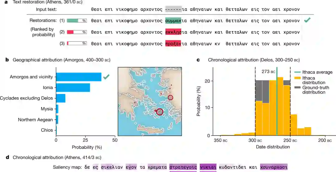 测试中,DeepMind将短语「δήμο το αθηναίων」(雅典的人民)中的「δημ」被隐去。伊萨卡不仅修复了文本,而且还预测了写作的时间和地点。