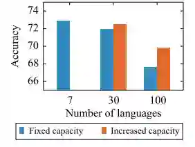 对于一个固定大小的模型,即模型参数量固定,随着参与训练的语种数量的增加,模型在每个语种上的性能表现会下降。虽然低资源语言的性能可以通过在预训练中添加类似的高资源语言来提高,但是总体下游性能受到这种“能力稀释”(capacity dilution)的影响。正向迁移和能力稀释之间需要做一个权衡。Figure 2 中展示了语种数量和模型能力稀释之间的实验结果。