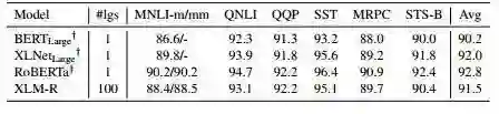 Table 4 展示了 XLM-R、BERT 和 RoBERTa 在GLUE上的实验结果: