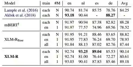 (3)在NER数据集的平均F1得分上,XLM-R比此前最先进模型高出了2.1%。