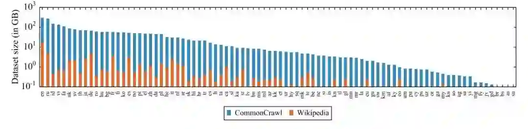 Figure 1:Wiki-100语料(用以训练XLM-100)和CC-100语料(用以训练XLM-R)的数据量对比情况。其中二者有88个共用语种,CC-100的数据是高出Wiki-100几个量级的,特别是在低资源语种上。