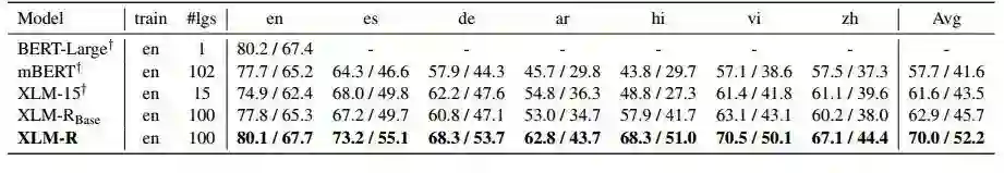 (2)在Facebook最近推出的[MLQA问题回答数据集](https://ai.facebook.com/blog/mlqa-evaluating-cross-lingual-extractive-question-answering/)上,XLM-R在平均F1得分和准确率上分别比mBERT高出12.3%和10.6%。XLM-R比此前最先进模型在F1上高出了8.4%。