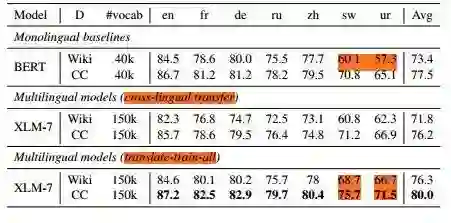 Table 5:多语种 Vs. 单语种模型。在7个语种上,对比了单语种模型BERT-BASE和多语种模型XLM。单语种和多语种分别选用40k和150k大小的词典。