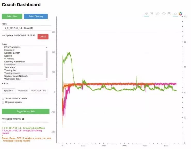 Intel还发布了CoachDashboard作为可视化和调试的补充工具。Dashboard是Coach的一个图形用户界面,通过展示训练过程中的不同信号,可以让用户以简单易懂的方式比较不同方式运行的训练质量。在训练期间,Coach可跟踪任何有意义的内部信息并存储,以便在执行期间和完成后可视化进度。