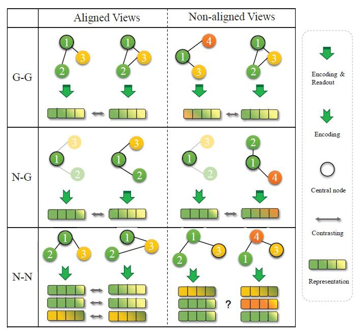 ▲ 图2:黑色加粗的为中心节点;在经过 encode 之后,为了得到 graph-level 的表征还会使用 readout 函数,这一操作会丢失较多信息。N-N 代表 node-node contrasting mode,N-G 代表 node-graph contrasting mode,G-G 代表 graph-graph contrasting mode。