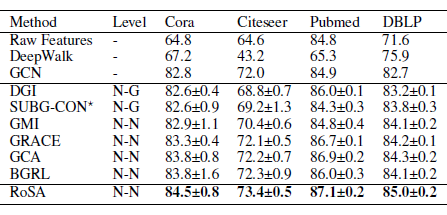 ▲ Table 2: Summary of classification accuracy of node classificationtasks on homophilous graphs. The second column representsthe contrasting mode of methods, N-G stands for node-graph level,and N-N stands for node-node level.
