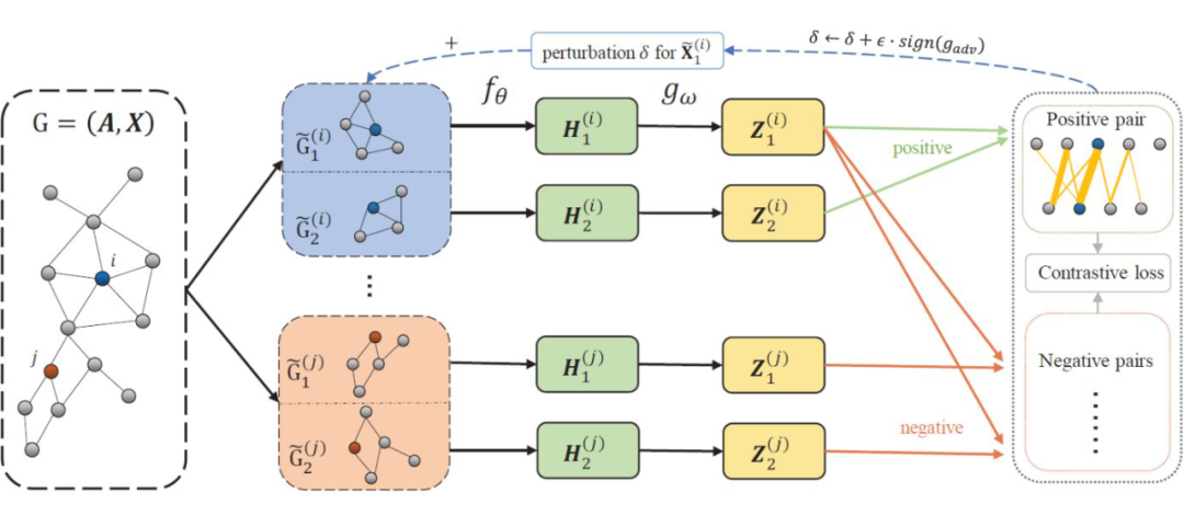 对抗训练可以认为是一种增强方式,它可以增加模型的鲁棒性。 [4] 通过实验证明了有监督情况下在节点特征上进行对抗训练可以进一步提升模型精度,我们将其引入到图对比学习中,公式如下: