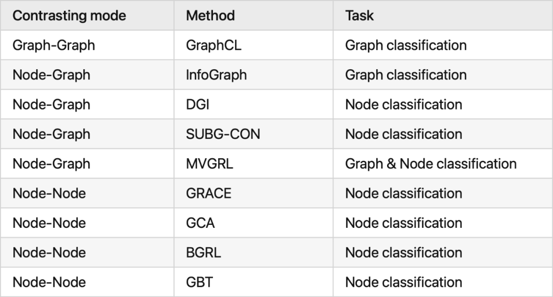 。node-level representations 之间进行对比称为 node-node contrasting level (i.e. local-local),node-level representation 和 graph-level representation 进行对比称为 node-graph contrasting level (i.e. local-global),global-level representations 之间进行对比称为 graph-graph contrasting level (i.e. global-global)。Table 1 是现有的一些方法的分类。