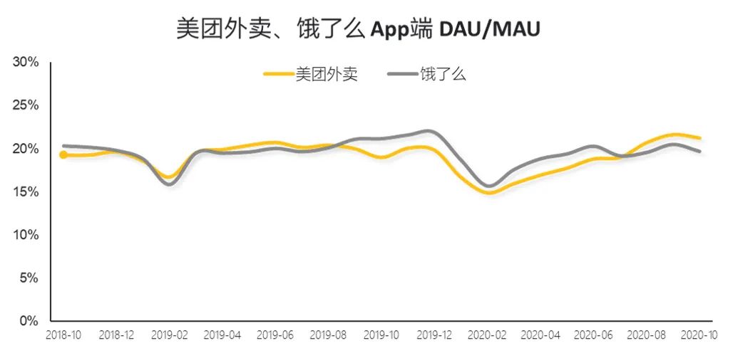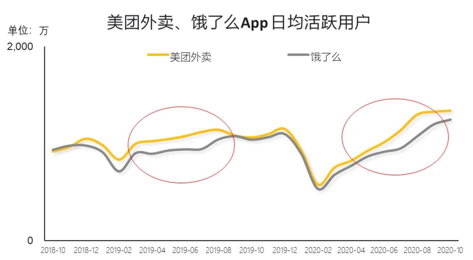 QuestMobile的数据显示,在2018年12月前,饿了么App端的月均日活用户数(DAU)是高于美团外卖的,但在12月后情况出现了变化,美团外卖DAU反超饿了么,并在每年的外卖旺季领先饿了么,冬季期间二者差距并不大。在补贴的帮助下,2020年旺季的差距同样没有缩小。