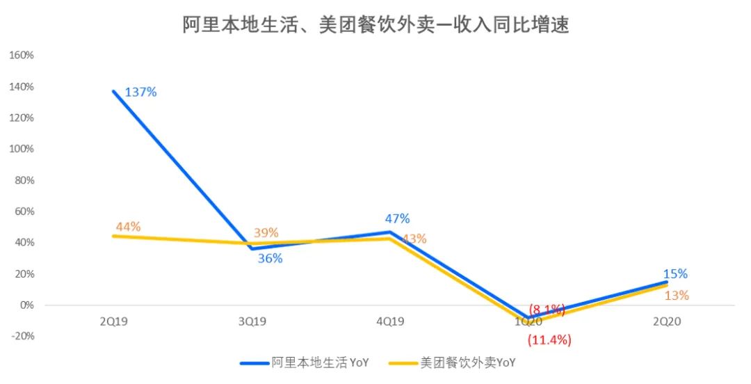 2020年二季度末的最新数据显示,美团的外卖城池依旧坚固。对比和阿里本地生活的营收数据,二者份额并无明显的变化,同比增长也处于近乎相同的步调。即便是19年Q2阿里本地生活的同比增速达到137%,这也是由于2018年底收购饿了么的推动所导致。