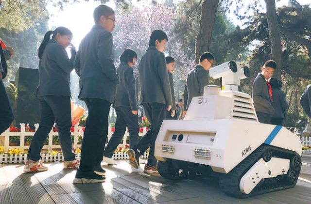 据报道,清明节期间,在长眠着共和国的开国元勋、战功显赫的革命将领、成就卓著的科学家、德艺双馨的艺术家等革命英烈的墓区林荫大道上,有一台小型机器人格外显眼。这台形似小坦克的履带式机器人身高1米左右,“双眼”顶在头顶,可实现360度旋转。它的主要巡视范围被设定在长100米左右的主干道上,车速跟行人步行的时速相近。另外机器人的“双眼”具有人脸识别功能,系统可设置黑白名单,通过人脸识别可识别出黑名单的特殊人员,并立刻向后台发出警报。